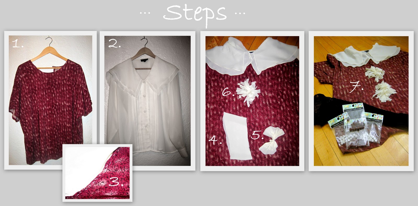 Place the collared blouse inside the t-shirt blouse and sew the seams of the two together (as seen in 3.) – when the seams are successfully attached, cut the rest of the collared shirt off about four inches below the stitched collar.