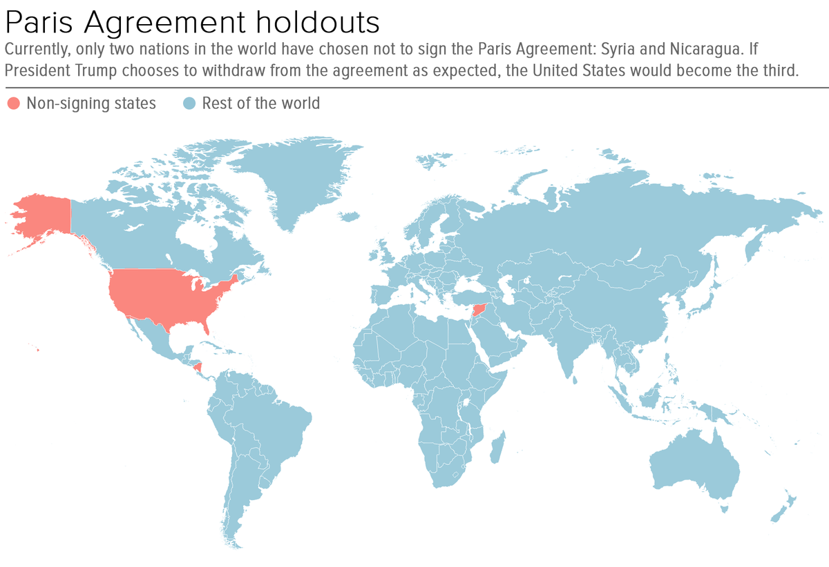 Today I saw an announcement that Donald Trump has pulled out of the Paris Agreement, this from the ‘leader’ of the world’s second largest greenhouse gas emitter, claiming the treaty will ‘harm‘ American jobs. An announcement which only confirms his lack of empathy and wholehearted selfishness amongst other evil things. This agreement isn’t about a single country’s economy or or loss of jobs, this agreement is about making minimal efforts towards saving all living things. Which is why every country in the entire world has signed the agreement, apart from Syria (because, you know, we’ve waged a heinous war on them and they’ve got daily survival to think about), Nicaragua (because they rightly felt the deal did not do enough to protect the climate), and now, The United States of America (because, Trump).